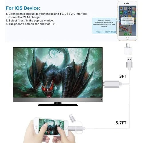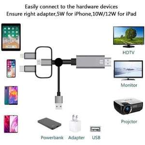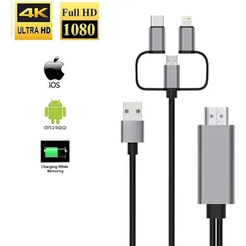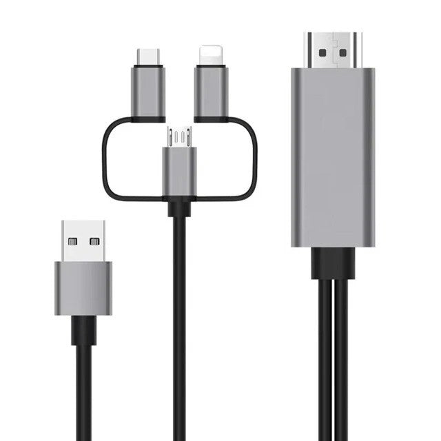 3-in-1 HDMI Adapter Cable, USB A Male to Micro USB/ Type-C/Lightning Port for Smartphones/Tablets, Silver/Black