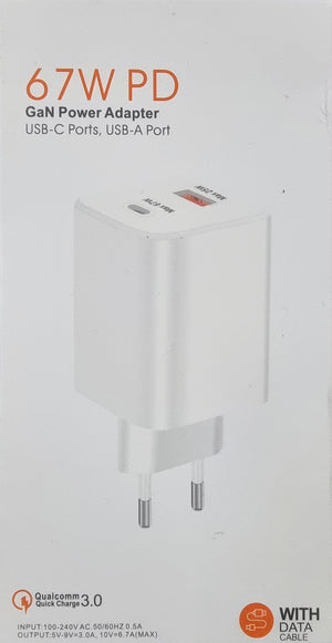 67W GaN USB-C & USB-A Quick Charger with Data Cable – Qualcomm 3.0 Power Delivery & Fast Charging