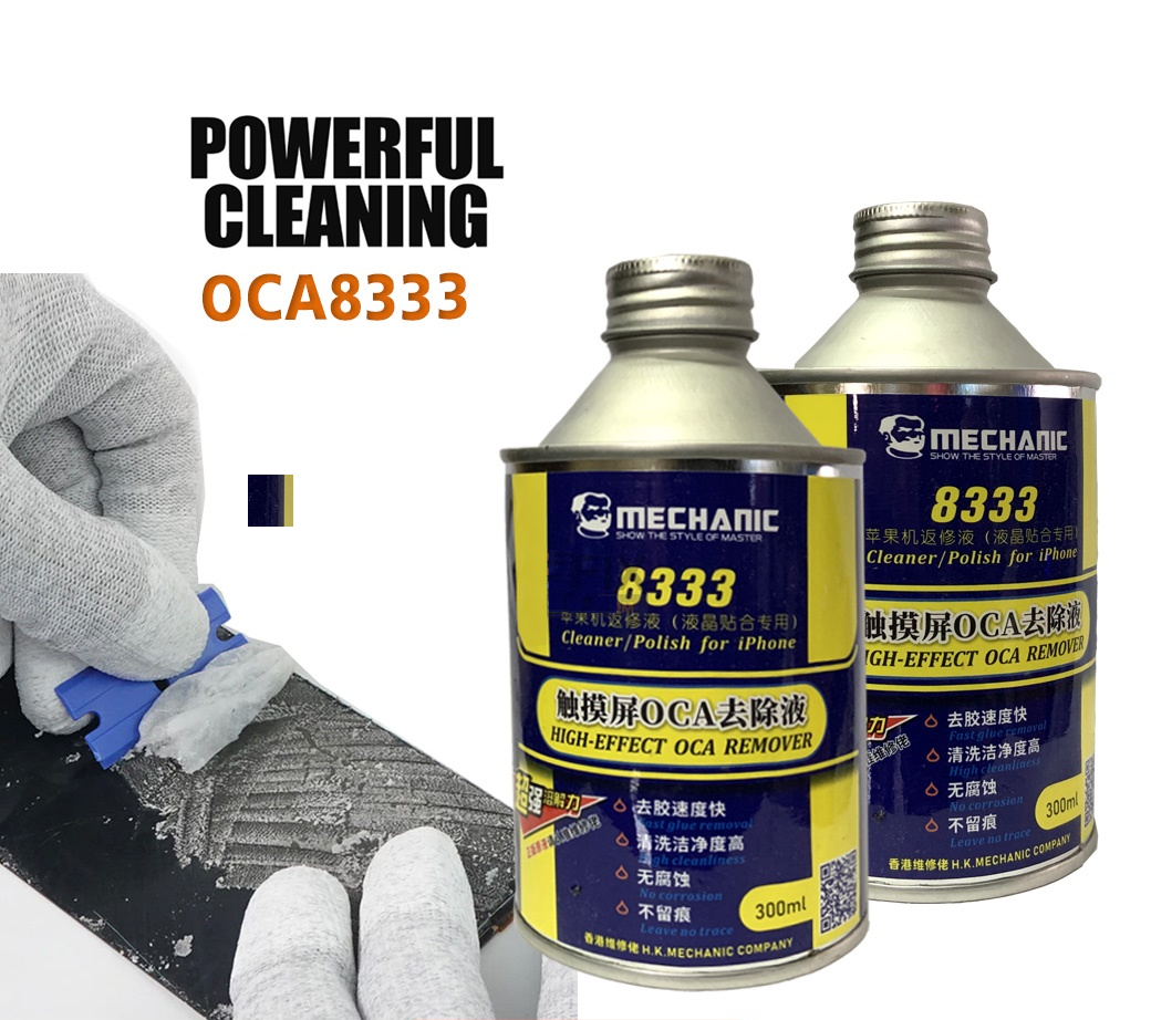 The Mechanic 8333 OCA removing liquid is a powerful and efficient solution that can quickly dissolve and remove the OCA from the smartphone screens. It is easy to use, just apply the liquid on the OCA and wait for a few minutes for it to dissolve the adhesive. Then gently scrape off the adhesive using a plastic scraper or a credit card.
