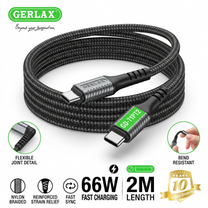 The Gerlax GD-71PT2 USB-C to USB-C Fast Charging Cable is a powerful and durable charging solution built for high-speed performance and long-lasting use. Supporting up to 66W Power Delivery (PD) fast charging, it delivers efficient and stable charging for laptops, smartphones, tablets, and other USB-C devices.