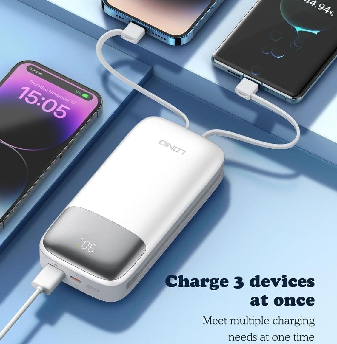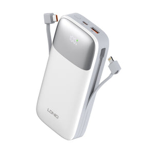 Charge on the go with the LDNIO 10000mAh power bank! Equipped with built-in iPhone π± and Type-C π cables, thereβs no need to carry extra wiresβjust take your power bank and go. With super-fast 20W charging for both iPhone and Type-C devices, plus an additional QC USB output, you can power multiple devices at the same time. The digital display π shows the exact battery level, and the durable ABS + copper construction ensures safety and reliability.