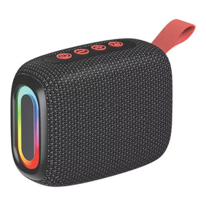 This portable Bluetooth speaker combines powerful sound with eye-catching RGB lighting to elevate your listening experience wherever you go. The wireless design offers complete freedom of movement, whilst the compact size makes it perfect for travel, outdoor adventures, or simply moving from room to room. Featuring a textured fabric exterior and a convenient carry strap, this speaker is built for portability without compromising on style. The vibrant RGB light ring adds a dynamic visual element that pulses and changes with your music, creating an immersive atmosphere for parties, gatherings, or personal enjoyment. Easy-to-use control buttons on top allow you to adjust volume, skip tracks, and manage playback with simple touches. Whether you're streaming your favourite playlist at the beach, hosting a braai, or relaxing at home, this wireless speaker delivers clear, quality audio in a portable package. The Bluetooth connectivity ensures seamless pairing with your smartphone, tablet, or other compatible devices, giving you instant access to your music library.