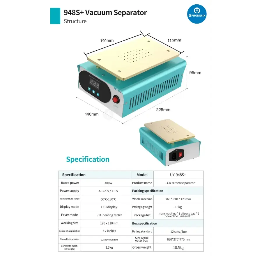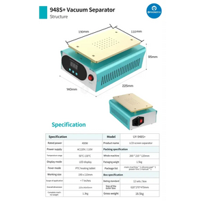 UYUE 948S+/Uyue 948T LCD touch screen separator for preheating separating screen. This LCD Separator with built-in vacuum pump, is suitable for mobile phone iPad tablet screen under 7 inches.